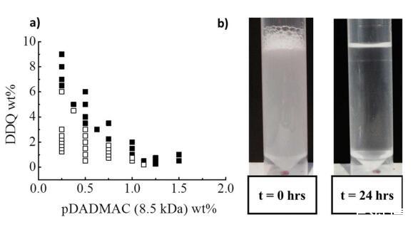 圖2:。(a)25°C下pDADMAC(8.5 kDa)/DDQ/水的相分離邊界:(□)單相和(■)兩個(gè)階段。(b)樣品pDADMAC(3 wt%)/DDQ(3 wt%)/水的相分離圖像(t=自上次攪拌以來(lái)的時(shí)間)。