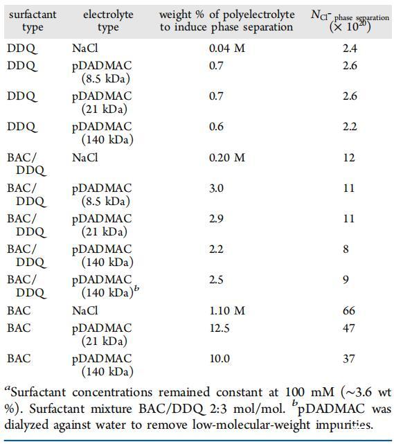 觀察到顯示分離相分離的NaCl/表面活性劑/水混合物,以產(chǎn)生富含表面活性劑的上層相,類似于聚電解質(zhì)/表面活性劑/水混合物中的相分離。這說(shuō)明,對(duì)于pDADMAC(21 kDa)和NaCl系統(tǒng),可以通過(guò)改變BAC/DDQ的比率來(lái)控制相界。