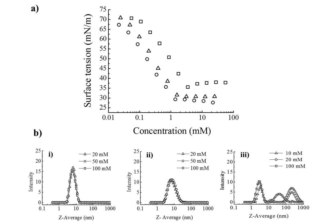 圖1:。(a)25°C水中的表面張力曲線(□)美國(guó)銀行(○)DDQ和(Δ)BAC/DDQ(2:3 mol/mol)。(b)25°C下的PCS強(qiáng)度曲線隨濃度變化:(i)BAC(0.3 M NaCl),(ii)BAC/DDQ 2:3 mol/mol(0.05 M NaCl),和(iii)DDQ(5×10?3 M NaCl)。