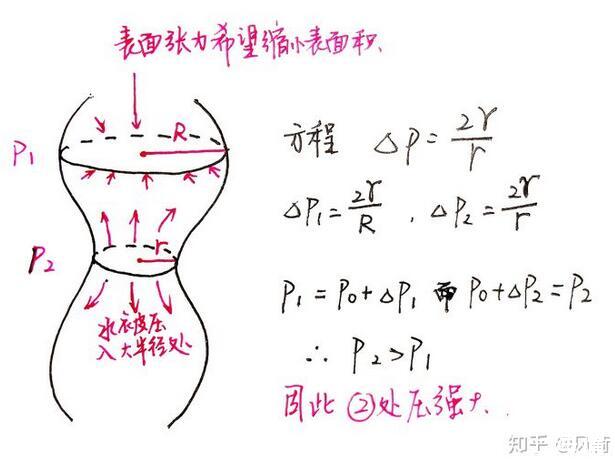 表面張力會像皮筋一樣收縮液體的表面積,同時壓力大(半徑小)的地方的水被擠到半徑大的地方,使得本來細(xì)的地方半徑變得更小。
