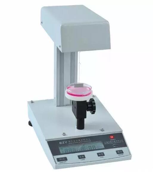 表面張力儀的結構,主要由扭力絲、鉑金環、支架、杠桿架、蝸輪付等組成。使用時通過蝸輪付的旋轉對扭力絲施加扭力,并使該扭力與液體表面接觸的鉑金環對液體的表面張力相平衡,當扭力繼續增加,液面被拉破時,扭力絲扭轉的角度,用刻度盤上的游標指示出來,此值就是M值,用mN/m表示。最后用M值乘以校正因子F,即得液體實際表面張力值δ。