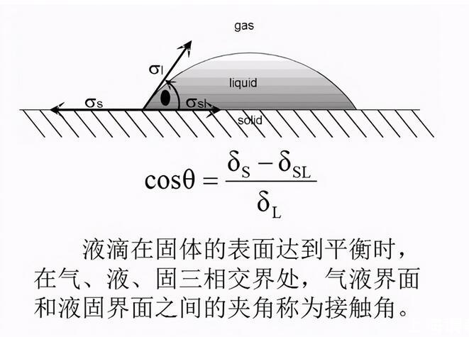 鋪展過(guò)程:表示在固液界面取代了氣固界面的同時(shí),氣液界面也擴(kuò)大了同樣的面積。