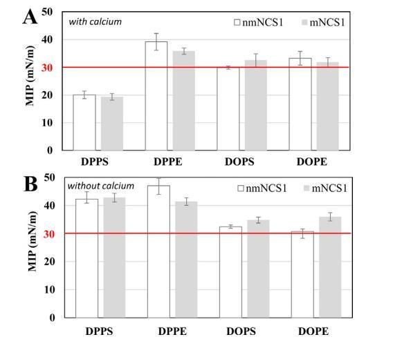 在沒有鈣的情況下,mNCS1采用無鈣構象,其結合膜的方式與存在鈣的情況不同。圖5比較了在存在和不存在鈣的情況下獲得的mNCS1的MIP和synergy值(數值見表S4)。當mNCS1不與鈣結合時,MIP值大于存在鈣的情況。事實上,在沒有鈣的情況下,所有MIP值都在30 mN/m以上,這表明當蛋白質與鈣結合時,該蛋白質能夠與任何膜蛋白結合。在沒有鈣的情況下,協同值也相當高,表明mNCS1和膜之間有很強的協同作用,無論其成分如何。DPPE、DOPS和DOPE單分子膜缺鈣對結合參數的影響很小,分別使MIP增加5.57、2.28和4.16 mN/m,協同效應分別增加0.16、0.00和0.07。無鈣構象似乎限制了mNCS1與PE脂質單層的膜結合。然而,在DPPS單層的存在下,MIP值增加了一倍多,從19.3 mN/m增加到42.8 mN/m。此外,在沒有鈣的情況下觀察到巨大的協同值增加。實際上,協同價值從?0.12至0.47,表明mNCS1的無鈣構象應隱藏其負電荷,并消除該單層與蛋白質之間的排斥作用(圖4)。mNCS1的負電荷殘基應埋在無鈣構象中,并暴露在鈣結合構象中,從而導致蛋白質排斥。在DOPS存在的情況下,協同值從0.38降低到無鈣的情況下的0.23。DO脂肪酰基鏈的獨特構型可以解釋這一數據。然而,在沒有鈣的情況下,MIP和協同值相當高,并且應允許mNCS1與由DOP組成的脂質結構域的膜結合。