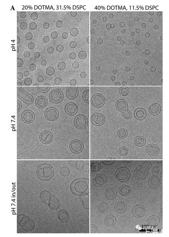 此外還發(fā)現(xiàn),采用乙醇稀釋/快速混合技術(shù)制備LNP-siRNA,當(dāng)siRNA含量較高時(shí),表現(xiàn)為堆疊的小雙層結(jié)構(gòu),其中siRNA被包載于緊密相連的脂質(zhì)雙分子層之間;當(dāng)siRNA含量較低時(shí),堆疊結(jié)構(gòu)的比例降低,LNP-siRNA復(fù)合物系統(tǒng)則表現(xiàn)出siRNA雙層結(jié)構(gòu)和非晶態(tài)電子致密核的組合,這可能是由中性形式的可電離陽離子脂質(zhì)產(chǎn)生的油滴而形成。所得結(jié)論為:含可電離陽離子脂質(zhì)的LNP體系在pH=4時(shí)形成雙層結(jié)構(gòu),在pH=7.4時(shí)形成非晶態(tài)“固體核”結(jié)構(gòu)。