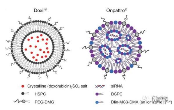 在組成方面,主要成分大致相同,都含有脂質(zhì)和膽固醇,只是脂質(zhì)納米粒所用的脂質(zhì)中必須要有可電離脂質(zhì),而脂質(zhì)體對(duì)脂質(zhì)的種類沒有嚴(yán)格要求。但在各成分的比例方面,脂質(zhì)體和脂質(zhì)納米粒存在較大差異,尤其是膽固醇的用量,以經(jīng)典的脂質(zhì)體產(chǎn)品DOXIL為例,HSPC:CHOL:DSPE-PEG2000=3:1:1;而已上市兩款mRNA新冠疫苗的組分中,膽固醇分別占比42.7%(Pfizer/BioNTech)和38.5%(Moderna),明顯高于脂質(zhì)體中膽固醇的含量。