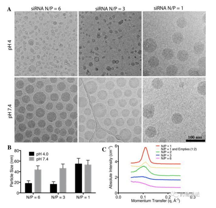 使用帶電荷脂質(zhì)制備siRNA-LNP時(shí),正電荷與負(fù)電荷的數(shù)量比會(huì)影響納米粒的大小、穩(wěn)定性、電位等性能。在siRNA-LNP中,正電荷通常為具有可電離銨根(N)的陽離子脂質(zhì),而負(fù)電荷則為帶有大量磷酸根(P)的核酸分子,兩者可通過靜電吸附的方式結(jié)合在一起。因此,不合理的比例可能會(huì)導(dǎo)致粒徑過大、穩(wěn)定性差等缺陷。值得一提的是,在研究中發(fā)現(xiàn),當(dāng)N/P=1時(shí),pH中和后LNP的粒徑不會(huì)有較大改變;當(dāng)N/P=3或者6時(shí),LNP在pH=7.4的緩沖液中粒徑會(huì)變大。而永久陽離子脂質(zhì)(例如DOTAP)制備的LNP在任何pH緩沖液中都不具有固體核心結(jié)構(gòu)。