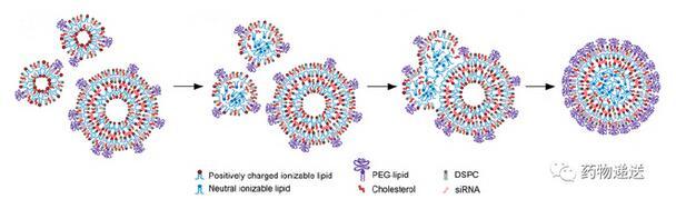 LNP-siRNA復(fù)合物是通過快速混合-乙醇稀釋過程形成,該復(fù)合物并沒有顯示出倒置的膠束結(jié)構(gòu),其中siRNA以“醋栗小圓面包”(currant bun)的形式分散在LNP內(nèi)部。相反,siRNA與緊密貼合的脂質(zhì)雙層膜相關(guān),雙層脂質(zhì)膜固定住siRNA分子,分離到LNP的外圍。過量的可電離陽離子脂質(zhì)會(huì)形成一個(gè)無定形的脂質(zhì)核心,類似于含有一定量膽固醇的油滴相。