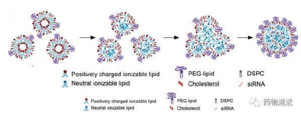 關(guān)于脂質(zhì)納米粒的形成,曾經(jīng)提出過一個(gè)“倒置膠束”(inverted micelles)假說,假說認(rèn)為可電離的陽離子脂質(zhì)先與核酸物質(zhì)締合形成反膠束結(jié)構(gòu),過量的可電離脂質(zhì)則形成“空”反膠束;反膠束和“空”反膠束締合形成疏水核,極性較大的脂質(zhì)成分(如DSPC)再對(duì)疏水核進(jìn)行包裹。然而,該假說并不能解釋脂質(zhì)納米粒制備過程中的某些特征現(xiàn)象,例如脂質(zhì)相和水相快速混合后的LNP-siRNA混懸液在pH=4.0時(shí)呈澄清透明,這表明此時(shí)脂質(zhì)納米粒復(fù)合物的結(jié)構(gòu)直徑小于30nm;以緩沖液透析置換后LNP-siRNA混懸液呈半透明,表明在此過程中形成了較大結(jié)構(gòu)的脂質(zhì)納米粒,也說明脂質(zhì)納米粒的粒徑在該工藝過程中由小變大。