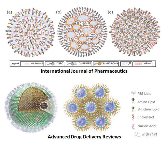 Moderna公司描述的mRNA-LNP結(jié)構(gòu)示意圖,以及International Journal of Pharmaceutics和Advanced Drug Delivery Reviews期刊描述的mRNA-LNP結(jié)構(gòu)示意圖則更為抽象,尤其是International Journal of Pharmaceutics期刊,描述了三種不同的結(jié)構(gòu)。