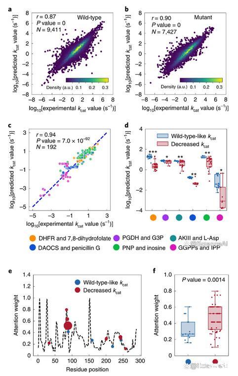 DLKcat可以捕獲kcat向精確的單個氨基酸替代方向的變化,從而能夠計算注意力權重,從而識別對酶活性產生重大影響的氨基酸殘基。氨基酸取代是酶進化領域的一項強大技術,通常用于探測酶催化機制。特別是,大多數替代實驗在底物結合位點區域進行誘變,因為假設結合區域將對催化活性產生很大影響。然而,據報道,偏遠地區會對催化活性產生深遠影響。