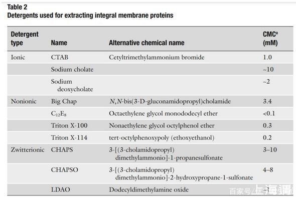 去垢劑的選擇:去垢劑別名表面活性劑、乳化劑、肥皂等等,分為離子型、非離子型和兩性離子型三類。去垢劑是同時具有親水性和疏水性基團的雙極性分子,能夠使磷脂雙分子層解體并釋放膜蛋白,并且為去膜狀態下的膜蛋白提供穩定的疏水環境。去垢劑也需要篩選合適的種類和濃度,各自優缺點見下圖。