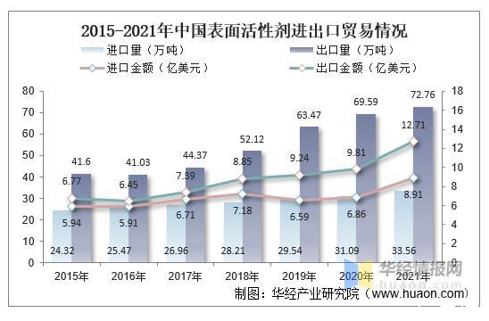 從進出口貿易情況來看,近年來我國表面活性劑進口量及出口均呈現上漲趨勢,進口方面主要以非離子表面活性劑為主,出口方面主要以陰離子表面活性劑為主。具體來看,2021年我國表面活性劑進口量為33.56萬噸,進口金額為8.91億美元;出口量為72.76萬噸,出口金額為12.71億美元。