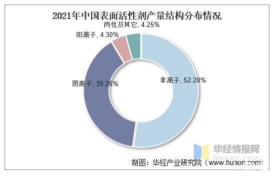從銷量結構情況來看,2021年我國非離子型表面活性劑銷量197.74萬噸,占比為52.24%;陰離子型表面活性劑銷量147.62萬噸,占比為39%;陽離子表面活性劑銷量16.4萬噸,占比為4.33%;兩性及其它銷量16.79萬噸,占比為4.44%。