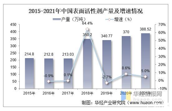 隨著我國表面活性劑起步較晚,但在國家的支持及相關企業的努力下,我國表面活性劑產業快速發展,目前已然成為全球表面活性劑產銷大國之一。隨著近年來洗滌用品等下游需求的穩定發展,推動我國表面活性劑需求持續增長,其產量也隨之不斷增加。據資料顯示,2021年我國表面活性劑產量達388.52萬噸,同比增長5%。