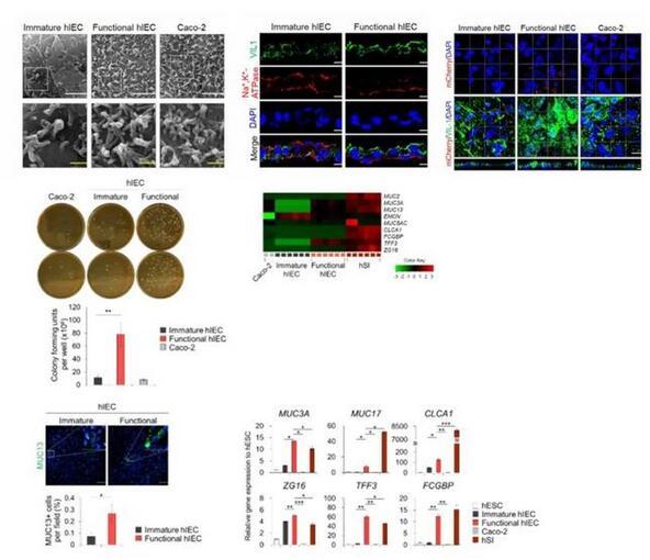 由于在hSI中,Wnt的抑制和Notch的激活有助于祖細胞分化為吸收前上皮細胞,研究者使用了Wnt信號抑制劑Wnt-c59和Notch信號激動劑丙戊酸(VPA),來進一步將hIEC祖細胞分化為與體內類似的成熟且有功能的hIEC。與其他僅由吸收性腸細胞組成的小腸上皮模型相比,該系統可以模擬體內樣腸組織進行研究。與未成熟的hIECs相比,功能性hIECs形成了一個結構極化的單層,并觀察到了類似杯狀細胞分泌出的粘液。此外,功能性單分子層hIEC的頂表面接觸的細菌數量明顯更高,并且黏液蛋白和黏液蛋白相關基因的表達在功能性hIEC中顯著增加能夠允許腸道微生物群的持續定植。