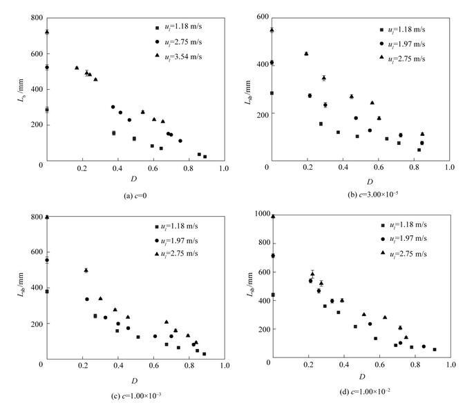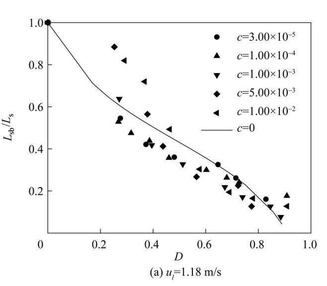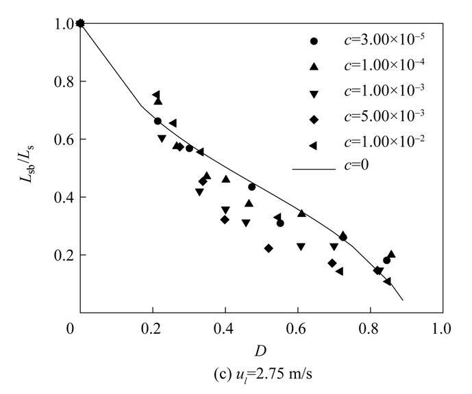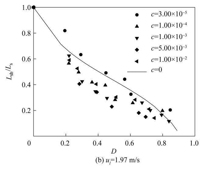 圖11是不同濃度表面活性劑射流破裂長度L sb隨氣泡無量綱直徑D=d b/d 0(d b為氣泡直徑)的變化。從圖中可以看出,不同表面活性劑濃度下,射流破裂長度隨氣泡無量綱直徑D的變化趨勢(shì)是相似的。射流破裂長度隨著氣泡直徑的增大逐漸減小;當(dāng)氣泡直徑相同時(shí),提高液體射流速度會(huì)導(dǎo)致更大的射流破裂長度。