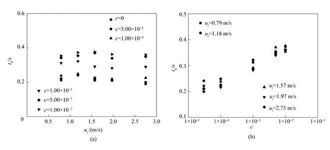 從圖7(a)中可以看出,當(dāng)表面活性劑濃度保持不變時(shí),射流破裂時(shí)間幾乎不隨射流速度的改變而改變。在射流速度保持不變時(shí),隨著表面活性劑濃度的增大,射流破裂時(shí)間呈現(xiàn)逐漸增長的趨勢(shì)。在實(shí)驗(yàn)參數(shù)范圍內(nèi),射流破裂時(shí)間均小于0.4 s。考慮重力對(duì)液體射流的加速作用,液體射流實(shí)際破裂時(shí)間要小于0.4 s。