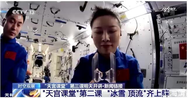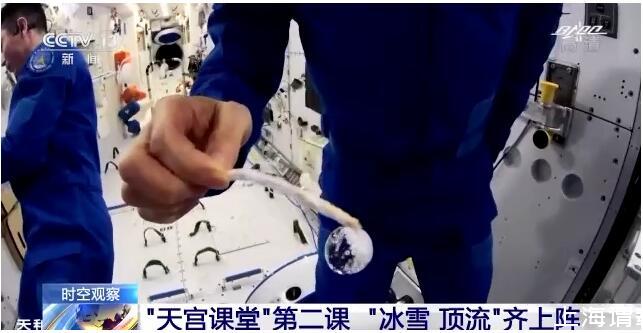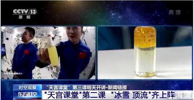 在約45分鐘的授課中,航天員演示了微重力環(huán)境下太空“冰雪”實驗、液橋演示實驗、水油分離實驗、太空拋物實驗,講解了實驗現(xiàn)象背后的科學原理,還展示了部分空間科學設(shè)施。