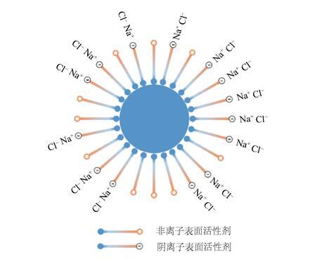 抑塵劑主要由陰離子表面活性劑、非離子表面活性劑以及其他助劑組成。其中,表面活性劑是一種具有兩親性的物質(zhì),加入少量能使其溶液體系的界面狀態(tài)發(fā)生明顯變化,是抑塵劑的重要組成部分。如圖4所示,煤塵表面暴露著大量的極性有機(jī)基團(tuán),水在煤塵表面很難發(fā)生潤濕行為;抑塵劑中的表面活性劑親油端與煤塵表面的有機(jī)基團(tuán)具有較好的相容性,能夠在煤塵表面定向排列并且將親水基團(tuán)引入煤塵表面,增加了水與煤塵之間的潤濕能力。無機(jī)鹽的引入對于陰離子表面活性劑具有增效作用。根據(jù)雙電層理論,雙電層可以分為緊密層和擴(kuò)散層,當(dāng)溶液中加入無機(jī)鹽后,無機(jī)鹽中的離子會壓縮擴(kuò)散層,使得擴(kuò)散層厚度減小,從而降低了界面能;同時(shí)其無機(jī)鹽離子還能減小雙電層中的靜電力作用,促進(jìn)了抑塵劑在煤塵表面的吸附,提高了潤濕性能。