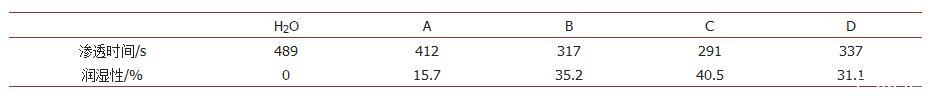 分別選用了四種抑塵劑A、B、C、D,使用正向滲透法研究了抑塵劑對于煤塵NR的潤濕能力的影響。如圖2所示,在水中加入抑塵劑可以增加在煤塵NR表面的潤濕能力,滲透時(shí)間大幅降低。四種抑塵劑的潤濕能力數(shù)據(jù)如表1所示,純水在煤塵表面4 cm的滲透時(shí)間為489 s。相比之下,抑塵劑C、B和D均能夠較大程度提高對煤塵的潤濕能力,滲透時(shí)間分別降低至291 s、317 s和337 s,潤濕能力相比純水分別提高了40.5%、35.2%和31.1%。抑塵劑A的潤濕能力相對較差,滲透相同煤塵距離所需要的時(shí)間為412 s,潤濕能力比純水僅提高了15.7%。