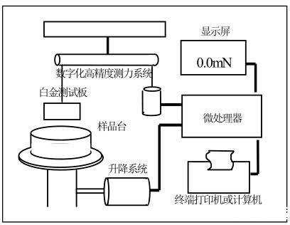 當白金板接觸到樣品液后,樣品液的表面張力會將白金板往下拉?;诟呔入娮犹炱降臄底只瘷z測系統檢測到這個微小的力并傳到微處理機進行處理。