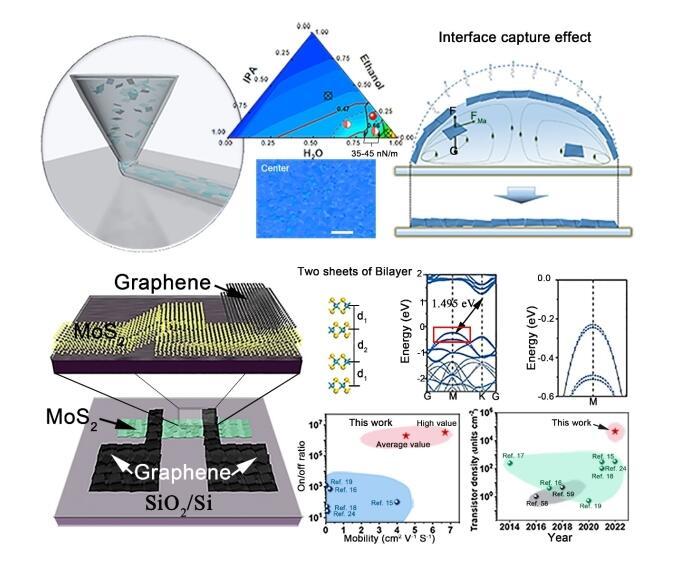 近日,化學(xué)所與清華大學(xué)、美國(guó)加州大學(xué)合作,提出了一種界面捕獲效應(yīng)打印策略。該策略使用低沸點(diǎn)水性超分散二維材料油墨,直寫打印二維半導(dǎo)體薄膜陣列,無需添加額外表面活性劑。具體而言,這一策略通過對(duì)剝離的半導(dǎo)體2H-MoS2納米片進(jìn)行分級(jí)離心,獲得了主要為雙層厚度的窄分布納米片;通過建立表面張力和組分比的三溶劑相圖,確定了合適的油墨溶劑。印刷超薄圖案(約3nm厚度)主要以單層或兩層的MoS2納米片連續(xù)均勻排列,并抑制了咖啡環(huán),空隙率較低(約4.9%)。研究使用商用石墨烯作為電極,制備的晶體管在室溫下顯示出6.7 cm2·V-1·s-1的遷移率和2×106的開關(guān)比,超過了此前印刷MoS2薄膜晶體管的性能。基于此,科研人員制備了高密度(約47000個(gè)/cm2)印刷晶體管陣列。該界面捕獲效應(yīng)打印策略可應(yīng)用于其他2D材料,包括NbSe2、Bi2Se3和黑磷,為印刷二維材料電子器件提供了新方法和新思路。