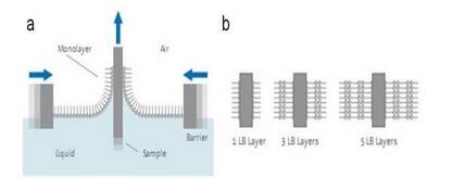 圖2(a).LB沉積過程示意圖;(b).多層單分子膜的制備
