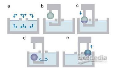 交替型LB膜分析儀的鍍膜過程如圖3所示。當(dāng)使用兩個(gè)單分子層壓縮沉積池和一個(gè)空白沉積池時(shí),可實(shí)現(xiàn)交替鍍膜,浸漬過程可在3個(gè)沉積池中選擇任意路徑多次循環(huán)(圖3a);在共同的亞相(淺藍(lán)色)上方,有兩種不同的單分子層(紫色和深藍(lán)色)(圖3b);上臂將樣品向下通過單分子膜,由下臂接住樣品。沉積循環(huán)也可從亞相開始,進(jìn)行第一層鍍膜(圖3c);下臂可根據(jù)需要旋轉(zhuǎn)到另一單分子層的沉積池或空白沉積池中,改變沉積池(圖3d);下臂提起樣品,傳遞給上臂(樣品從任意一側(cè)通過兩個(gè)單分子層中任意一個(gè)),進(jìn)行第二層鍍膜(圖3e)。