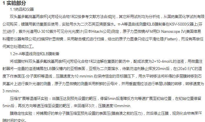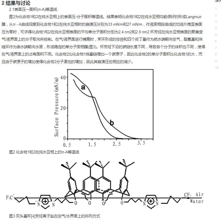 Langmuir-Blodgett膜技術(shù)(LB膜)是一種精確控制薄膜厚度和分子排列的單分子膜沉積技術(shù),即在水氣界面上能將成膜材料分子加以緊密有序地排列,形成單分子層,然后再轉(zhuǎn)移到固體襯底上的制膜技術(shù),利用該技術(shù)可以將功能化合物的光學(xué)、電磁學(xué)、分子識(shí)別與催化等性質(zhì)轉(zhuǎn)移到膜材料中。杯芳烴是繼環(huán)糊精、冠醚之后出現(xiàn)的第三代超分子主體分子,它具有空腔可調(diào)節(jié),構(gòu)象可變換,并易于化學(xué)改性和修飾等特點(diǎn),特別是對(duì)它進(jìn)行適當(dāng)修飾以后的化合物在材料化學(xué),配位化學(xué),生物化學(xué)等領(lǐng)域表現(xiàn)出潛在的應(yīng)用前景與研究?jī)r(jià)值。基于上述認(rèn)識(shí)最近我們合成了雙頭基多氟烷基兩親杯芳烴化合物1和2(圖1),并對(duì)該化合物在空氣/水相界面的成膜性能以及LB膜的結(jié)構(gòu)進(jìn)行了研究。
