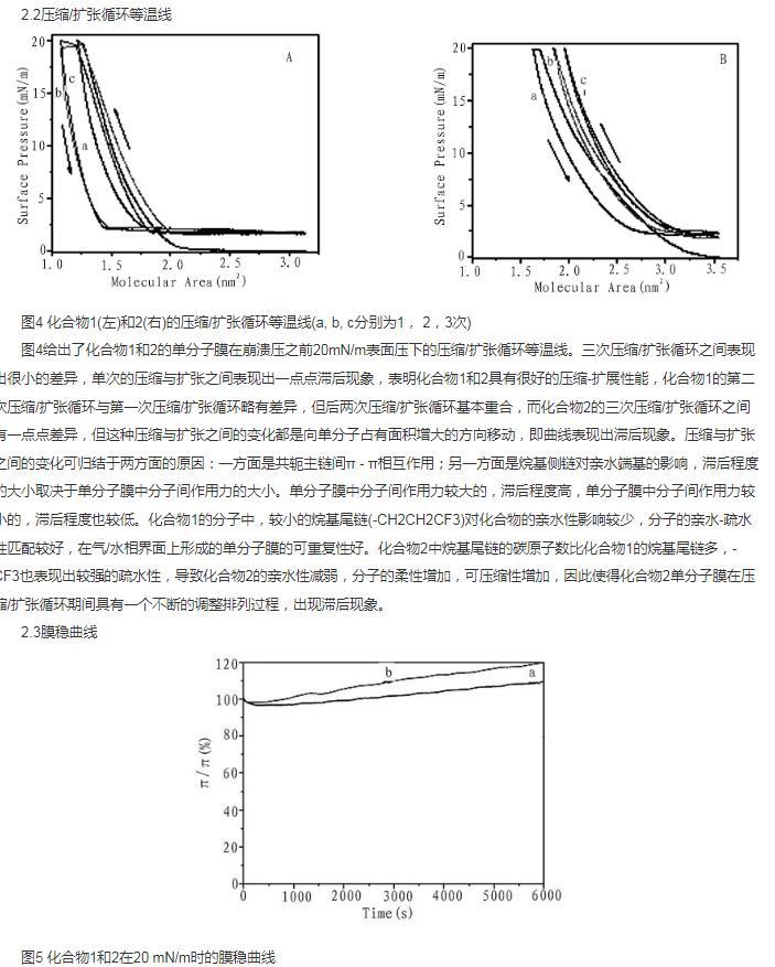摘要:合成了雙頭基多氟烷基兩親杯芳烴化合物1和2,利用表面壓一面積(π-A)等溫線、壓縮/擴(kuò)張循環(huán)等溫線與膜穩(wěn)曲線研究了他們?cè)诳諝?水相界面的成膜性能,并用紫外光譜和原子力顯微鏡對(duì)組裝的LB膜進(jìn)行了結(jié)構(gòu)表征。結(jié)果表明:化合物1和2在空氣/水相表面均能很好的形成穩(wěn)定的Langmuir膜,取代基碳原子數(shù)的增加使得化合物2的Langmuir膜單分子面積增加,崩潰壓相應(yīng)減少,組裝的LB膜均為H-聚集體,結(jié)構(gòu)均勻,穩(wěn)定性好。