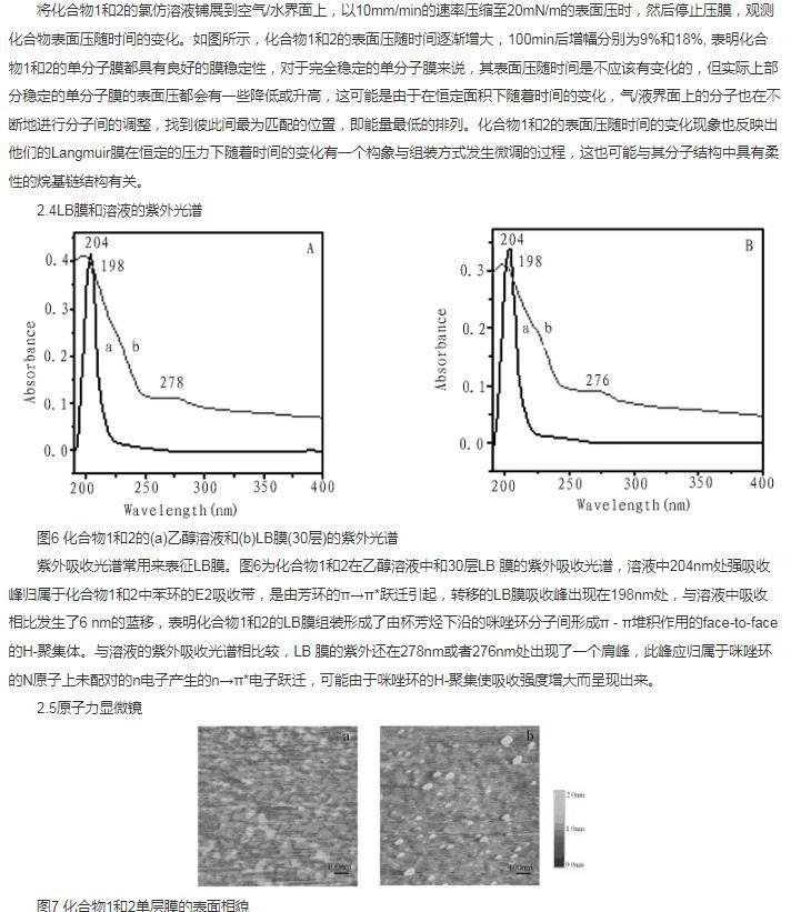 合成了雙頭基多氟烷基兩親杯芳烴化合物1和2,并對(duì)該化合物在空氣/水相界面的成膜性能進(jìn)行了研究,利用表面壓一面積(π-A)等溫線、壓縮/擴(kuò)張循環(huán)等溫線與膜穩(wěn)曲線,紫外光譜和原子力顯微鏡對(duì)組裝的LB膜進(jìn)行了結(jié)構(gòu)表征,表明化合物1和2在空氣/水相表面均能很好的形成穩(wěn)定的Langmuir膜,取代基碳原子數(shù)的增加使得化合物2的Langmuir膜單分子面積增加,崩潰壓相應(yīng)減少,組裝的LB膜均為H-聚集體,結(jié)構(gòu)均勻,穩(wěn)定性好。