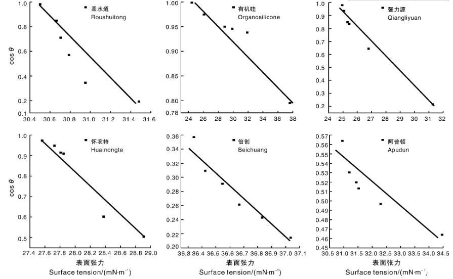 添加合適的噴霧助劑可以改善農藥的噴霧性能,增強農藥對靶標物的沉積性,進而增強防治效果。合理使用噴霧助劑可以降低藥液的表面張力和接觸角。盡管表面張力并非增強藥液在靶標物上持留和鋪展的唯一因素,但是表面張力能夠影響霧滴的大小,從而改變藥液在靶標上的沉積量。本文綜合研究了不同類型的噴霧助劑對吡蟲啉、阿維菌素和苦參堿3種藥劑表面張力和接觸角的影響,并分析了3種藥劑在添加不同質量濃度的6種噴霧助劑后藥液的表面張力與接觸角間的關系。結果表明,6種噴霧助劑均能降低3種藥劑的表面張力和接觸角。添加不同質量濃度的噴霧助劑后,藥液的表面張力與接觸角的余弦值存在顯著的負相關關系,與以往研究報道的結果一致。