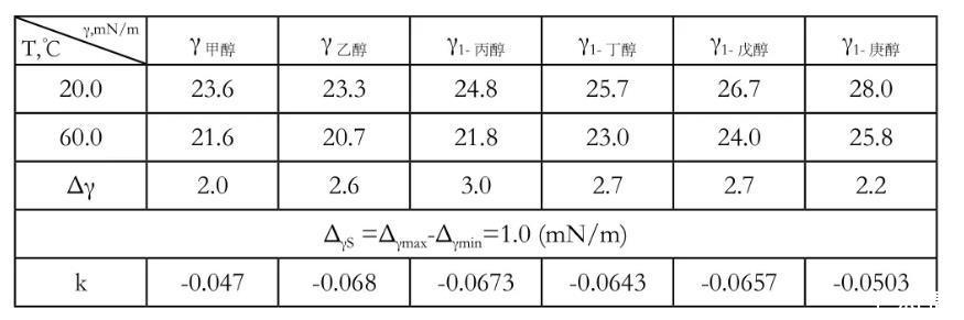 由于不同液態(tài)醇類的液態(tài)性質不同,其表面張力變化的程度如下表: