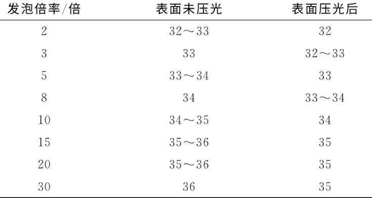 由表2可看出,隨著發泡產品倍率提高,材料表面張力會增加。發泡材料的微觀泡孔結構,改變了表面特性,增加了液體的潤濕,發泡倍率加大,單位體積內泡孔數增加,表面泡孔結構更利于浸潤。發泡材料剛完成發泡后,其表面張力小于發泡前對應的母片,這是因為發泡在高溫下進行,使得表面進行了結晶融化和重新結晶,改變了前期輻照交聯引起的表面變化。同一材料,若表面壓光處理后,表面張力會略有下降,這是因為壓光改變了材料表面的泡孔形態,形成了一層平整表皮,不利于液體的浸潤。