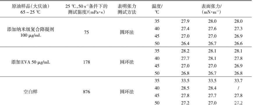 從表1可以看出,處理后添加納米級復(fù)合降凝劑100μg/mL大慶油樣、添加傳統(tǒng)EVA降凝劑50μg/mL大慶油樣、大慶空白油樣在25℃、50 s-1測試條件下的黏度是依次升高的,添加納米級復(fù)合降凝劑100μg/mL的大慶油樣品黏度最低,為75 mPa·s。相同的測試溫度條件下,黏度越大的油樣表面張力越大。其中,空白油表面張力最大,添加傳統(tǒng)EVA降凝劑的油樣次之,添加納米級復(fù)合降凝劑的油樣最小。原油油品的表面張力隨著溫度的降低而增大。
