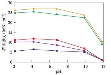 圖3pH對油水界面張力的影響飽和分;▲—芳香分;●—膠質(zhì);■—瀝青質(zhì);◆—380號燃料油