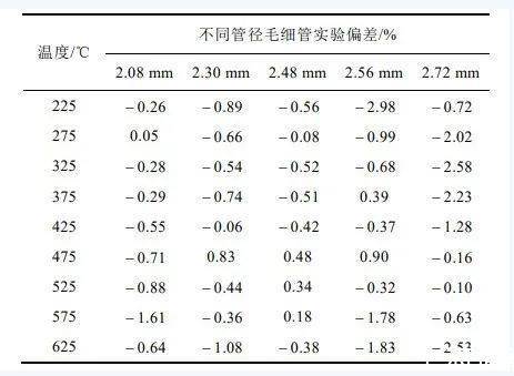 不同管徑毛細管在不同溫度下實驗結果偏差如上表2所示??芍?.72 mm內徑毛細管與基準值偏差最大,且在不同溫度的實驗偏差波動也是最大,從表中結果可以得出,隨著毛細管內徑增大,實驗結果偏差和偏差波動隨之增大。而2.08mm、2.30mm、2.48mm三個管徑的偏差相差不大,且從低溫到高溫偏差范圍波動較小。因此,在均勻鼓泡下,實驗使用的毛細管管徑應控制在2.0~2.5mm。