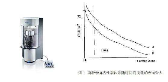 圖1顯示兩個不同表面活性劑體系A和B在不同吸附速度下,隨時間t而變化的表面張力γ,也可以叫作動態表面張力。這些曲線可以通過使用KRüSS最大氣泡壓力法來測量。氣泡在表面活性劑溶液中以不同的頻率形成,控制氣泡形成的時間并且測量氣泡中所產生的最大壓強,可以得到不同時間下的表面張力。在短時間內,觀察到表面活性劑體系B比A的體系所帶來的表面張力更小。