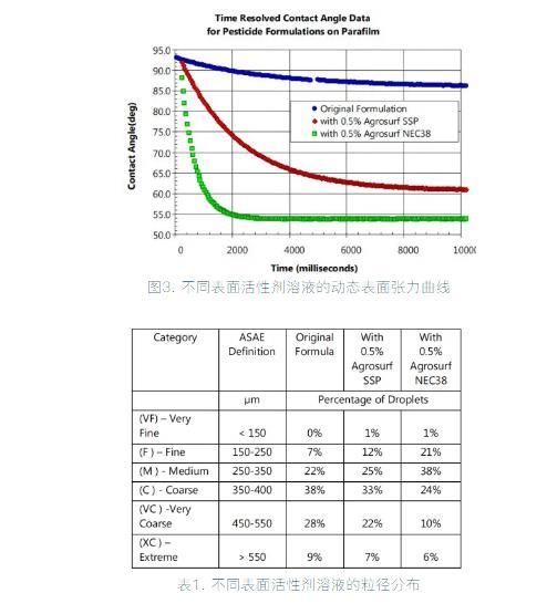 在實際生產中,噴頭尺寸、噴霧壓力也是改變噴量、霧滴粒徑的重要手段之一。本文僅討論了動態表面張力的改變對噴霧粒徑的影響,期望能為配方設計工作者提供合適的思路。