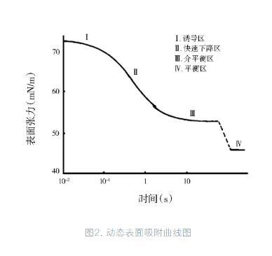 許多體系的動態表面張力和時間對數的曲線可分為4個階段:誘導區、表面張力快速下降區、介平衡區和平衡區。在誘導區,由于吸附在界面層上的助劑質量濃度太低,溶液的表面張力較大;隨著助劑大量被吸附到溶液表面,表面張力急劇降低,就形成了快速下降區;而隨著溶液表面助劑分子的積累,吸附接近飽和時吸附速度變慢,就形成了介平衡區;足夠長的時間后當表面吸附達到飽和體系進入動態平衡階段表面張力達到平衡,此即為平衡表面張力。表面活性劑種類和質量濃度不同,其溶液體系達到上述各階段所需時間不同,表現為各溶液體系間動態表面活性的差異。