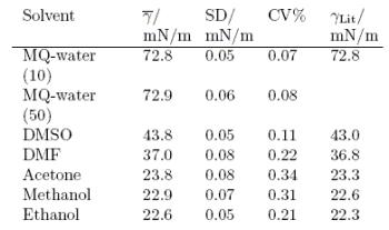 下表列舉了幾種廣為人知的溶劑的表面張力數(shù)據(jù)來(lái)闡述了Kibron傳感器的準(zhǔn)確性和精確性,每種溶劑都連續(xù)測(cè)定5次并且利用常規(guī)的統(tǒng)計(jì)學(xué)方法來(lái)分析相關(guān)數(shù)據(jù)。對(duì)表面張力的均值進(jìn)行了一個(gè)比較,結(jié)果和文獻(xiàn)值是相一致的。